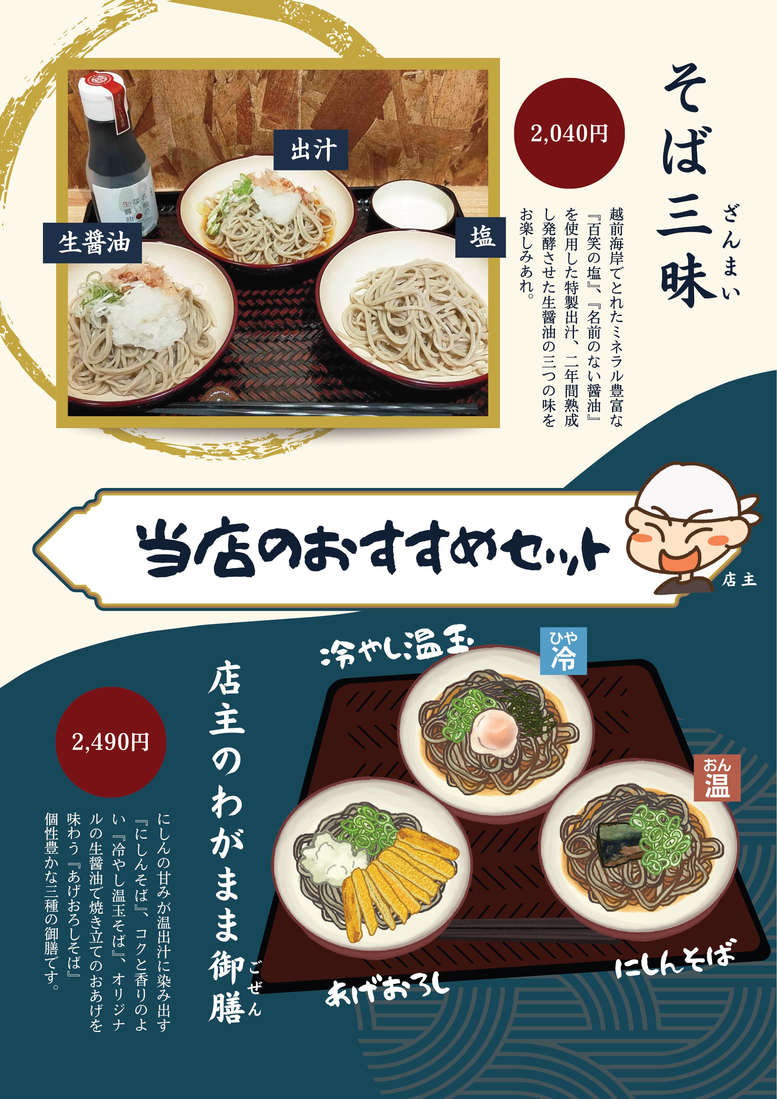 週替わりでそば粉、製粉所をかえ十割手打ちそばを提供しています。ふくいの豊かさを感じていただけると幸いです。
